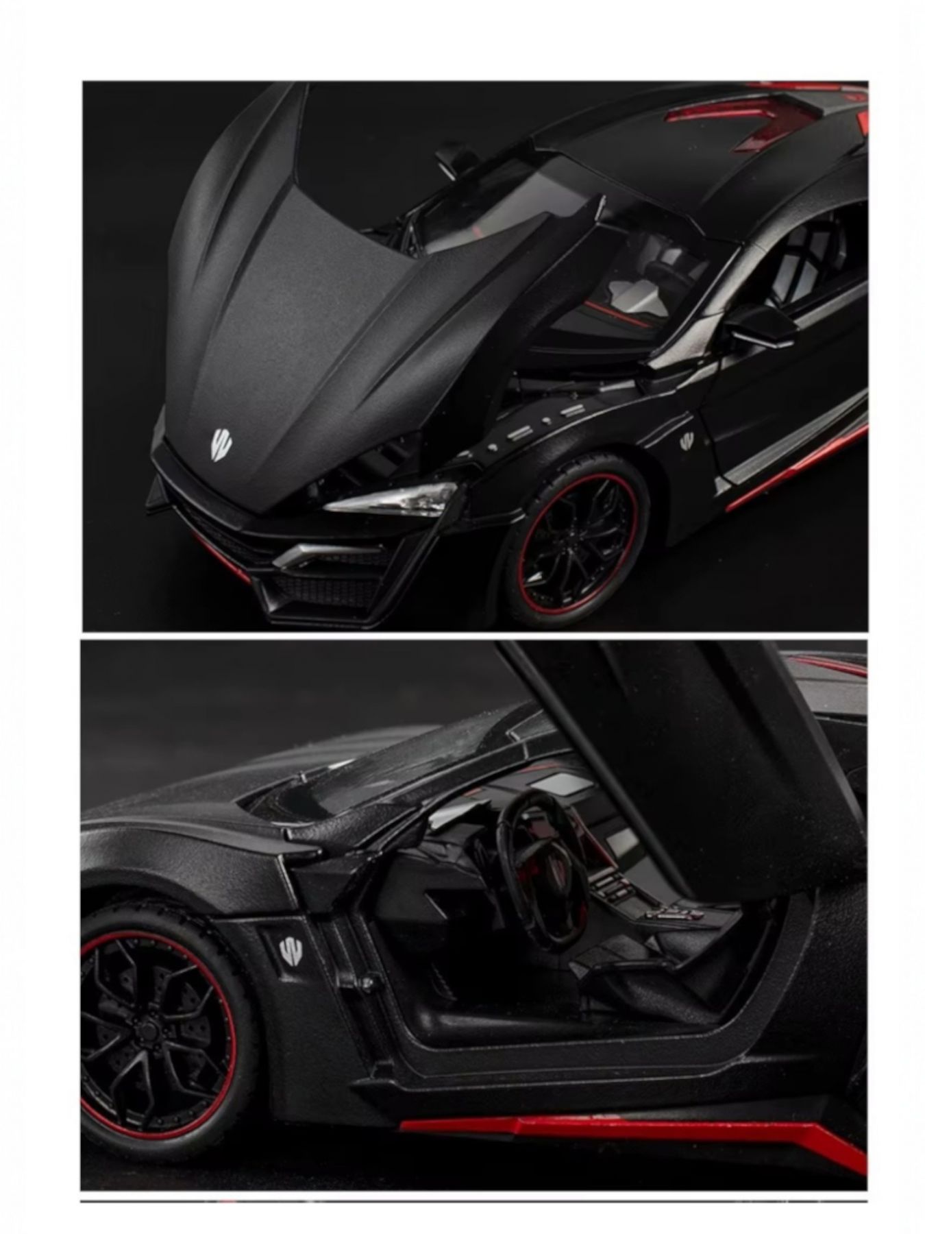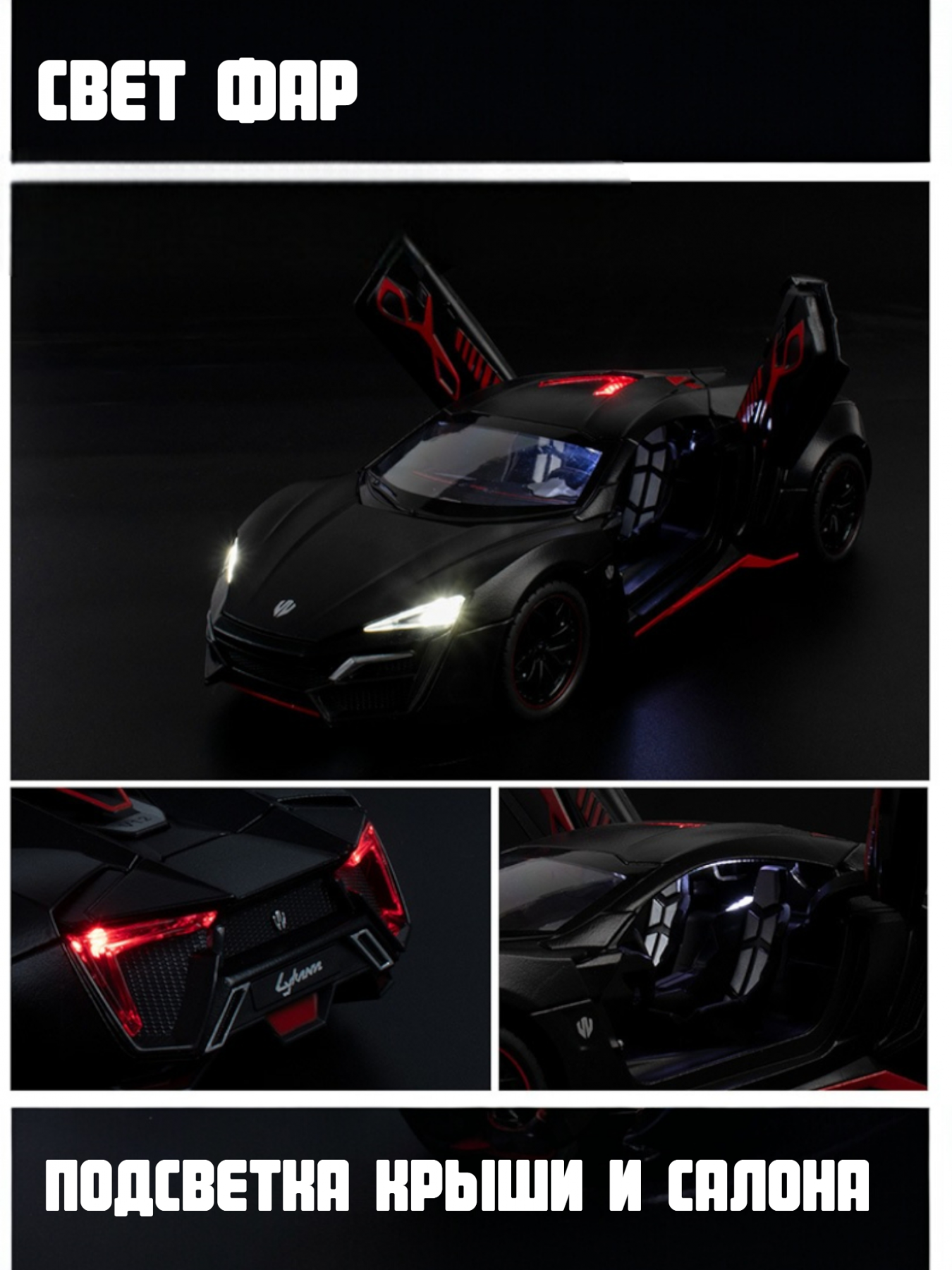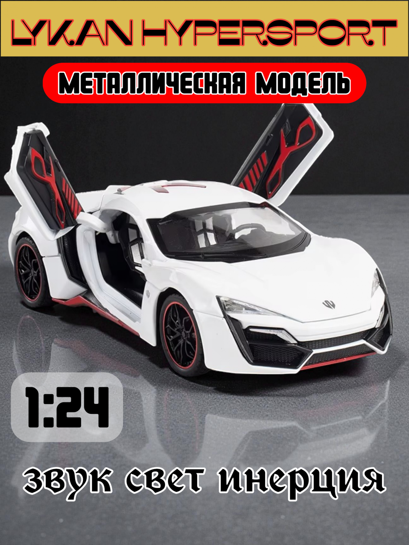 Lykan HyperSport — ливанский гиперкар ограниченного производства компании W Motors. Редчайшая модель в мире моделирования. Полностью функциональный автомобиль в большом масштабе 1:24. У машинки все открывается. Загораются фары, работает звук. Высокая детализация кузова и салона. Подсветка работает так же и в салоне автомобиля.