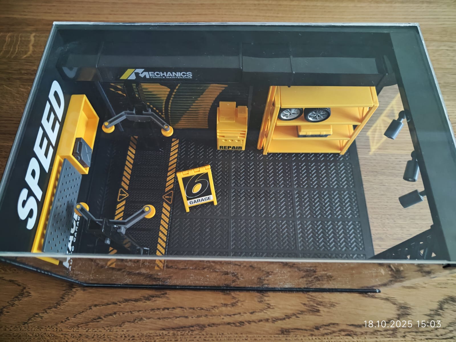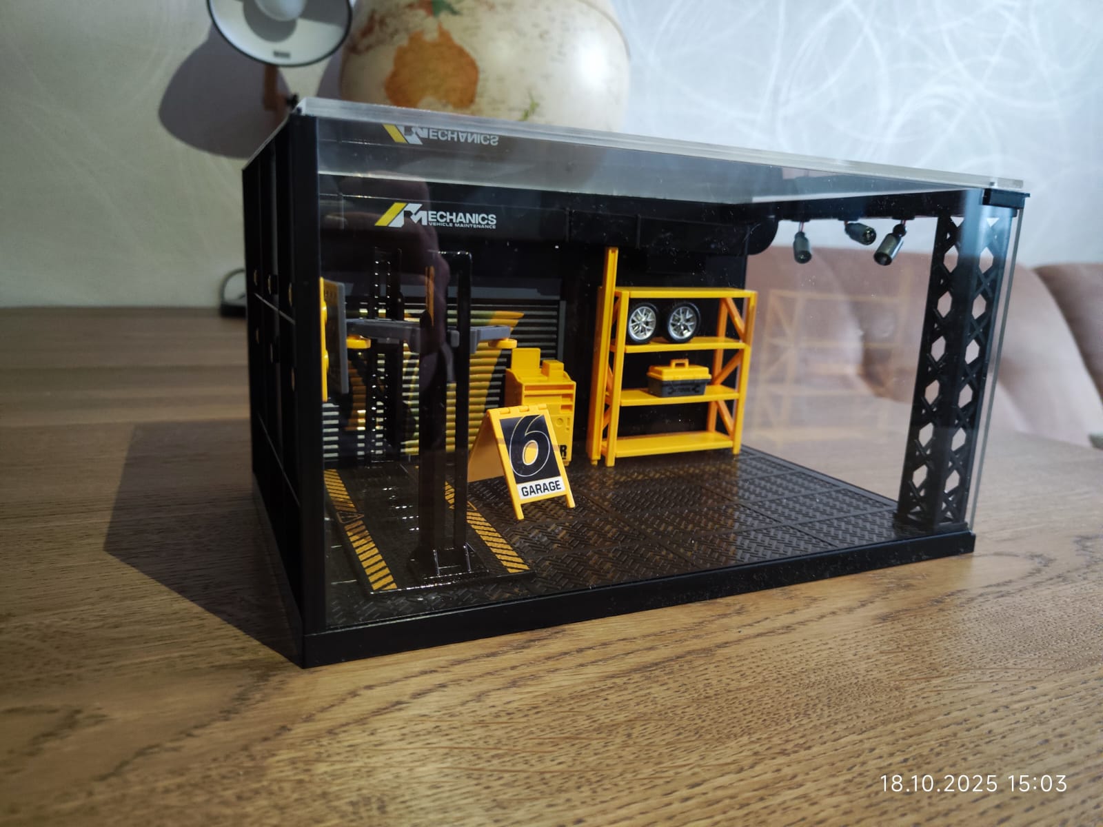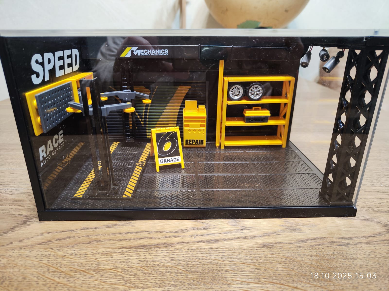Выставочный бокс для ваших автомобилей в масштабе 1:24 с подсветкой, аксессуарами и подъемником из металлизированного сплава. Гараж защищен акриловым стеклом, что позволит сохранить вашу коллекцию от внешнего воздействия. Гараж автосервис можно использовать для игры с любыми автомобилями до масштаба 1:24.